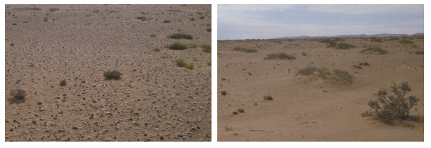 1.2 样地选择与采样点布设在吉兰泰盐湖西北方向(主害风方向)距离湖边约5 km的地方设置长期监测样地(样地中心地理坐标39°47′41″ N,105°40′04″ E,海拔1 040 m),样地面积为250 000 m2(500 m × 500 m)。地貌类型为巴音乌拉山山前堆积型戈壁,地势为西北高于东南。样地内不同区域植被生长状况差异明显,东部生长有白刺、沙冬青等,且形成了灌丛堆;而西部仅散生草本和小灌木,如骆驼蓬、刺叶柄棘豆等(图 1)。