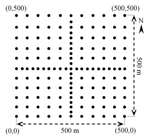 样地选定后,以样地西南角作为样地的原点位(0, 0),然后向正东方向布设500 m长的样线,在样线上每隔50 m设一个采样点;从南往北依次每50 m布设1条样线。此外,为满足地统计学分析中尺度分析需要,在从西向东、南向北方向居中的样线上加密采样点,以组成不同尺度的样点距离,采样点共计141个(图 2)。在布设采样点的过程中,为了保证每条样线的走向端直,采用经纬仪和100 m卷尺相结合的方式来精确布设采样点。