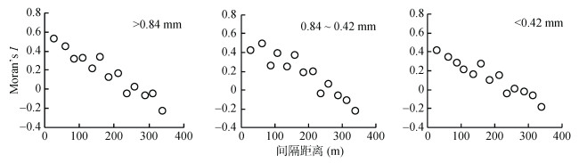 图 3表明,> 0.84 mm、0.84 ~ 0.42 mm和 < 0.42 mm颗粒在采样尺度上I值最大值与最小值分别为0.54和-0.22、0.50和-0.22、0.42和-0.18,三者差异不显著(P > 0.05)。3个粒级颗粒的I值随间隔距离增大整体上均呈线性下降趋势(R2分别为0.93、0.88、0.92),表明研究区地表颗粒呈现一定的空间结构性。在0 ~ 230 m范围内均表现出正相关;随着距离增大,其值逐渐向负方向增长,从正空间自相关到达负空间自相关,但负相关增加幅度较小。自相关图的变化趋势表明地表不同粒级颗粒的空间分布格局均呈斑块状。这与在研究区所调查的情况相一致,采样区西部地表植被分布较少,粗颗粒较多,为一种性质的斑块;采样区东部植被覆盖度增加,粗颗粒减少而细颗粒相对增多,为另一种性质斑块。此外,自相关图的变化趋势说明了研究区地表颗粒的变异主要由结构性因素引起,即地表颗粒的空间异质性主要与成土过程及区域气候因素等有密切的关系。