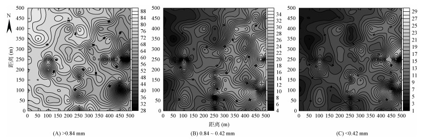 根据变异函数模型,采用普通克里格法空间插值,用Surfer 8.0软件绘制颗粒空间分布等值线图(图 4)。