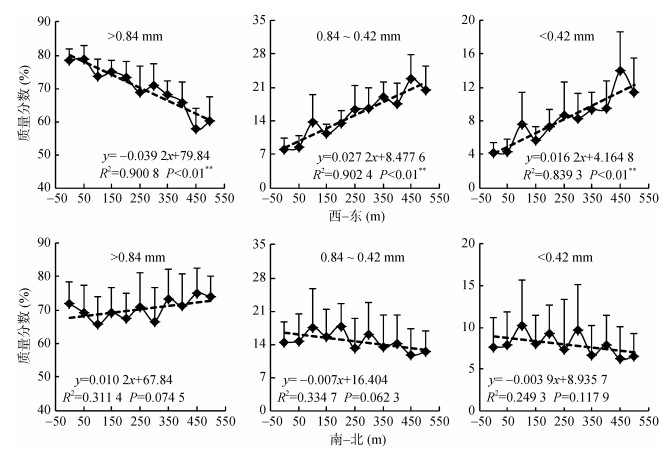 此外,为了定量揭示采样区内3个粒级颗粒的空间分布及变化情况,将采样区内南北走向的11条样线,每条样线上所有样点的同一粒级颗粒质量分数平均,分析地表不同粒级颗粒从东向西的分布及变化情况;同样的方法,分析不同粒级颗粒从南向北的分布及变化情况(图 5)。从采样区西部到东部,> 0.84 mm颗粒极显著减少(P < 0.01),而0.84 ~ 0.42 mm和 < 0.42 mm颗粒极显著增加(P < 0.01);从南到北,> 0.84 mm颗粒增加,0.84 ~ 0.42 mm和 < 0.42 mm颗粒减少,但均未达到显著水平(P > 0.05)。