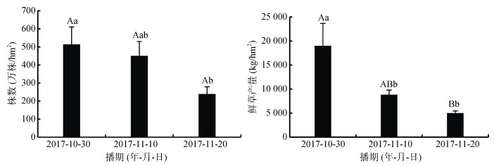 不同播期对紫云英单位面积株数和鲜草产量产生影响。试验结果显示(图 1),随着播期的推迟,每公顷株数呈下降趋势。10月30日播种的最多,达513.77万株/hm2,11月20日最少,两者间相差274.91万株/hm2,差异达显著水平。而10月30日和11月10播种的处理间株数差异不显著