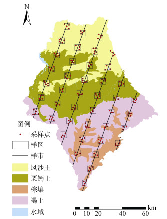 1 材料与方法 1.1 研究区概况研究区位于内蒙古自治区赤峰市东南部的敖汉旗(41°42′ ~ 42°02′N、119°30′ ~ 120°54′E),全旗总面积约为8 300 km2,总体地势南高北低,地形起伏多变,海拔为300 ~ 1 250 m;年降水量在310 ~ 460 mm之间,降水自南向北递减;年蒸发量2 000 ~ 2 600 mm,年平均气温为6 ℃,冬季寒冷干燥,夏季温热且降雨集中,属于温带半干旱大陆性气候。敖汉旗处于欧亚干草原区,地带性植被以疏林草原为主,受区域水热条件和地形等因素的影响,自然植被分布具有较明显的南北差异,从南到北呈现出由森林和森林草原逐渐向干草原过渡的规律,同时受生境条件的影响,有沙生植被以及灌丛植被分布。全旗主要分布有4个土类(图 1),南部山地主要为棕壤和褐土,中部黄土丘陵及黄土漫岗主要为栗钙土,北部沙地主要为风沙土,以流动、半流动、固定沙地和覆沙地为主。敖汉旗土地利用类型多样,属于农牧交错地带,是以农为主,农牧林结合的经济类型区(图 2)。其中,林地面积为3 945 km2,全旗形成带网片、乔灌草相结合的防护林体系;耕地面积为1 776 km2,约占全旗面积的21.39%;研究区北部以旱作农业为主,中部及北部多分布水浇地,主要种植作物为玉米、高粱、谷子等。牧草地面积为1 695 km2,占全旗面积的20.41%。