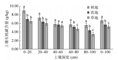 本研究发现敖汉旗土壤有机碳含量主要富集在0 ~ 40 cm深度的土壤中,占100 cm深度剖面内有机碳含量的47.80%,40 cm深度以上的土壤有机碳含量显著高于其他深度土壤碳含量。这一研究结果与王欣等[16]在该地区的研究结论相符,其他研究也普遍认为土壤有机碳的垂直分布规律表现为随着土壤深度的增加有机碳含量逐渐降低[17-18]。土壤有机碳的垂直分布特征主要受植被根系分布和有效土层厚度的影响。在本研究中,林地、农田和草地土壤有机碳含量在垂直分布上存在显著差异,这与不同土地利用类型上植物根系的延展长度密切相关。