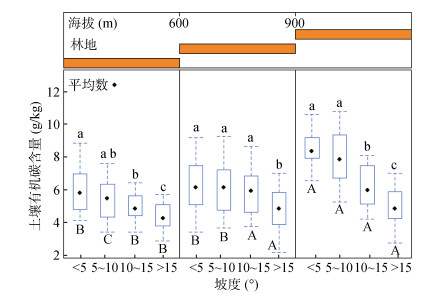 (图中上下虚线表示数据最大值与最小值;小写字母不同表示在同一海拔下,不同坡度间土壤有机碳含量差异达到P < 0.05显著水平;大写字母不同表示在同一坡度下,不同海拔分区之间土壤有机碳含量差异达到P < 0.05显著水平,下图同) 图 4 不同地形上林地有机碳含量的分布特征 Fig. 4 SOC contents in woodlands on different terrains |