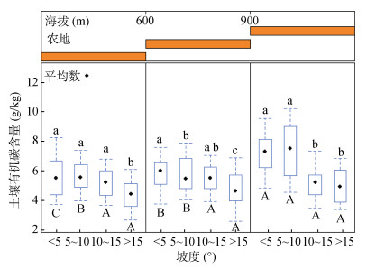 在相同海拔上农地土壤有机碳含量整体均表现为随着坡度的增加有机碳含量降低的特点。海拔在900 m以下时,坡度 > 15°的土壤有机碳含量显著低于其他坡度(P < 0.05);当海拔在 > 900 m时,坡度 > 10°的土壤有机碳含量显著低于其他坡度(P < 0.05)。