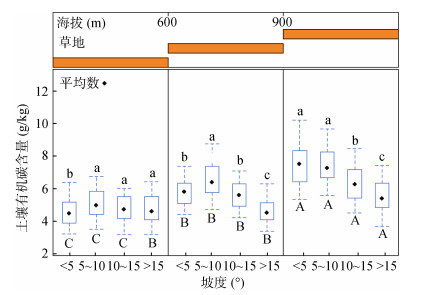 2.2.3 草地土壤有机碳含量空间分布特征如图 6所示,草地土壤有机碳含量在2.46 ~ 10.13 g/kg之间,其平均含量为4.90 g/kg。海拔对草地土壤有机碳含量的影响较为明显,当坡度 < 15°时,土壤有机碳含量随着海拔的升高而显著升高(P < 0.05)。当坡度 > 15°时,900 m以上海拔的土壤有机碳含量显著高于900 m以下海拔上的土壤有机碳含量(P < 0.05)。