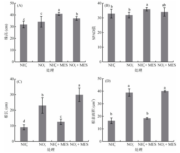 2 结果与分析 2.1 NH4+和NO3-对水稻生长的影响不添加pH缓冲剂MES的条件下,水稻株高和叶绿素含量在NH4+和NO3-处理之间没有显著差异;添加MES后,NH4+处理的水稻株高显著高于NO3-处理,叶绿素含量也略高于NO3-处理(图 1A、B)。不管NH4+还是NO3-处理,添加MES对水稻株高和叶绿素均有促进作用(图 1A、B)。对于水稻根长和根表面积,不论添加MES与否,NH4+处理均显著低于NO3-处理(图 1C、D)。而且对NH4+和NO3-处理,添加MES均显著增加了水稻根长,但是对根表面积没有显著影响(图 1C、D)。