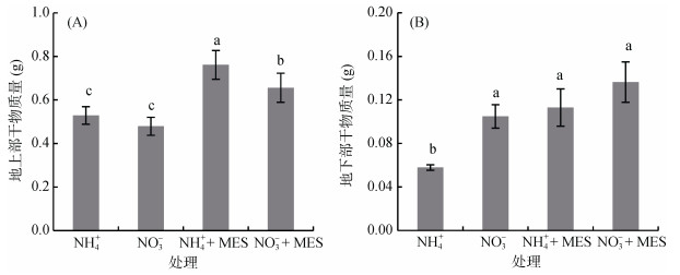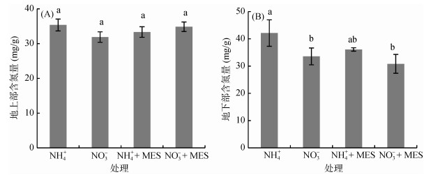 不同处理之间地上部含氮量没有显著差异(图 3A);NH4+处理地下部含氮量显著高于NO3-处理,而添加MES后二者没有显著差异(图 3B)。