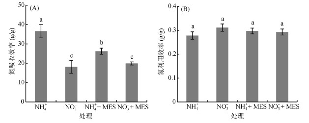 不管是否添加MES缓冲剂,水稻在NH4+处理下的氮吸收效率均高于NO3-处理;MES降低了NH4+处理的氮吸收效率,而对NO3-处理的氮吸收效率没有显著影响(图 4A)。不同处理之间的水稻氮利用效率差异不显著(图 4B)。