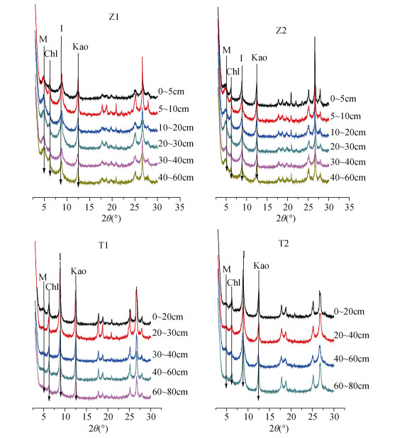 2 结果与分析 2.1 准噶尔盆地和塔里木盆地盐渍化土壤黏土矿物的类型根据盐渍化土壤中黏土矿物定向片的XRD图谱判断,两盆地内盐渍化土壤中主要黏土矿物类型包括蒙脱石、伊利石、绿泥石和高岭石。以准噶尔盆地的剖面Z1和Z2以及塔里木盆地T1和T2为例(图 2),对比XRD衍射图发现,剖面Z1和Z2各土层蒙脱石衍射峰(M)的峰强比剖面T1和T2中蒙脱石衍射峰的峰强强,伊利石衍射峰(I)的峰强则相反,绿泥石(Chl)和高岭石(Kao)衍射峰没有显著差异。