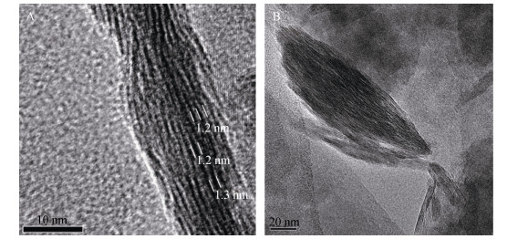 (A:蒙脱石的1.2 ~ 1.3 nm晶格条纹;B:弯曲呈波浪形的晶格条纹) 图 4 准噶尔盆地盐渍化土壤中黏土矿物TEM图像 Fig. 4 TEM images of clay minerals of salinized soil in Junggar Basin of Xinjiang |