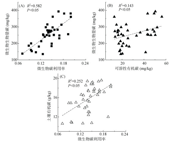 由图 2可知,砂姜黑土有机碳、微生物生物量碳与微生物碳利用率的变化规律一致,且微生物生物量碳也与可溶性有机碳具有相同的变化趋势。砂姜黑土微生物生物量碳与微生物碳利用率呈现正相关(图 2A,P < 0.05),即微生物生物量碳含量越大,微生物碳利用率就越高;此外,微生物生物量碳含量也随着可溶性有机碳含量的增加而增加(图 2B,P < 0.05)。由图 2C可以看出,砂姜黑土有机碳含量与微生物碳利用率呈现正相关(P < 0.05)。这表明砂姜黑土中微生物碳利用率与微生物生物量碳、有机碳及可溶性有机碳密切相关,土壤中微生物生物量碳、有机碳和可溶性有机碳含量越高,微生物碳利用率就越大。