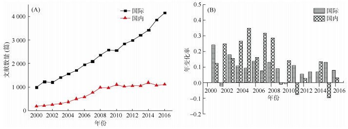 (A. 2000—2016年各年国内外年总文献刊发情况;B.国内外文献年刊发环比变化态势) 图 1 国内外年发文量及变化情况 Fig. 1 Total amounts and changes of domestic and foreign documents on soil heavy metals |