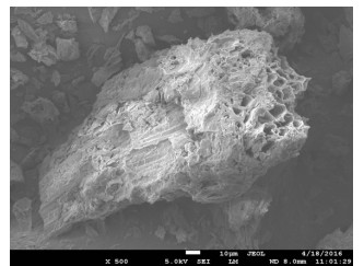 图 1 花生壳炭电镜微观表面扫描图(放大500倍) Fig. 1 SEM image of peanut shell biochar (amplified 500 times) |