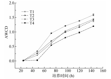 1.4 数据处理与分析土壤微生物利用碳源的整体能力,用平均颜色变化率(AWCD)表示[20-21],计算方法如下:
