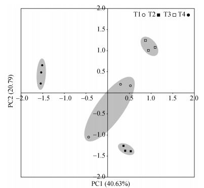由图 3主成分分析可知,T1处理分布在第一和第三象限,T2处理分布在第四象限,T3处理分布在第一象限,T4处理分布在第二象限。在主成分分析中,PC1的方差贡献率为40.63%,PC2的方差贡献率为20.79%,累积达到61.42%。T1处理在PC轴上出现较大分异,表现出微生物群落的不稳定性。不同施氮量对微生物群落功能多样性的影响在空间距离差异上分布较明显,表明肥料用量导致微生物群落代谢功能改变。T1和T2处理出现在不同象限,表明添加生物质炭对微生物功能多样性也有一定的影响。T3和T1处理在第一象限内的空间分布距离较短,说明二者在微生物群落功能多样性方面差异较小。