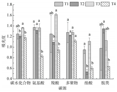 图 4 不同处理土壤微生物群落对6类碳源的利用强度 Fig. 4 Utilization intensities of 6 carbon sources by soil microbial communities under different treatments |
