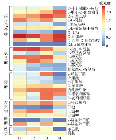 对6类共31种碳源进行分析(图 5),各处理对碳水化合物(D-纤维二糖、α-D-葡萄糖-1-磷酸)、羧酸(衣康酸、D-苹果酸、丙酮酸甲酯)、多聚物(α-环式糊精、吐温80)、胺类(腐胺),无显著性影响。T1、T2和T3处理对碳水化合物(D-半乳糖酸-γ-内脂、i-赤藓糖醇、D-木糖)、氨基酸(L-天门冬酰胺、L-精氨酸)、多聚物(吐温40),无显著性影响,T4处理显著低于其他处理。对各处理优势碳源中的具体碳源种进行分析发现,T1处理的土壤微生物对氨基酸类的L-苏氨酸和甘氨酰-L-谷氨酸的碳源利用强度较大,且明显高于其他处理;T2处理土壤微生物对胺类中苯乙胺的利用显著高于其他处理;羧酸类的γ-羟基丁酸、D-苹果酸、丙酮酸甲酯、D-半乳糖醛酸和D-葡萄糖胺酸在T3处理中的利用显著高于其他处理。T4处理微生物对碳水化合物类的β-甲基-D-葡萄糖苷和N-乙酰-D-葡萄糖胺的利用强度大,显著高于其他处理。土壤微生物对酚酸类利用强度较小,主要是因2-羟基苯甲酸含量较低。