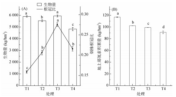 图 6A显示不同处理烤烟干物质积累T3 > T1 > T2 > T4,T1和T3处理无显著性差异,各处理较T1处理分别下降了6.16%、–0.7%和18.21%。烟株根冠比为T3 > T4 > T2 > T1,表明添加生物质炭有利于烟株根系的生长。图 6B显示烤烟旺长期地上部氮素积累量T1 > T2 > T3 > T4,生物质炭对烟株旺长期氮素积累有一定的降低作用,且随着施肥量的减少,氮素积累量降低。T1较各处理氮素积累量提高14.7、17.55和25.8 kg/hm2。