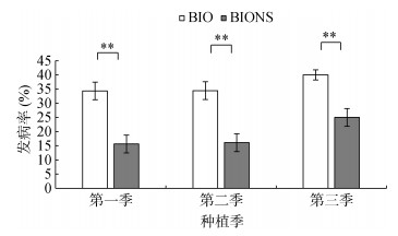 由图 1可知,单施生物有机肥处理(BIO)3季田间番茄青枯病发病率分别为34.38%、34.46%和40.00%,移栽生物育苗基质所育种苗处理(BIONS)的发病率分别为15.63%、16.11%和25.00%,与BIO处理相比,BIONS处理显著降低了3季番茄青枯病的发病率,分别达到了54.55%、53.25%和37.50%的田间防控效果。