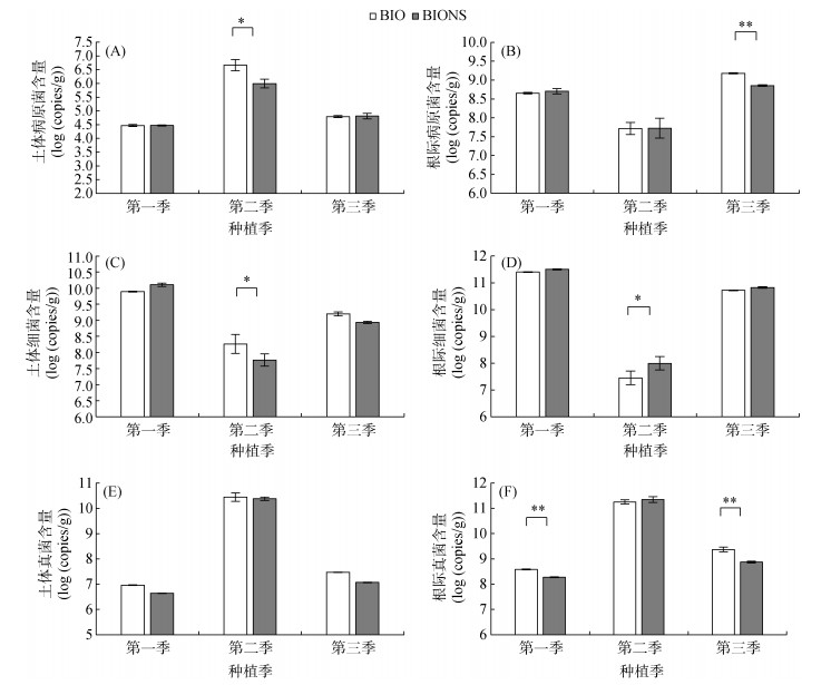 由图 2C和2D可知,第一季BIONS处理土体总细菌数量高于BIO处理但无显著性差异,第二季和第三季均低于BIO处理,且在第二季两处理间具有显著性差异。BIONS处理根际总细菌数量在3季田间试验中均高于BIO处理,第二季两处理间具有显著性差异。