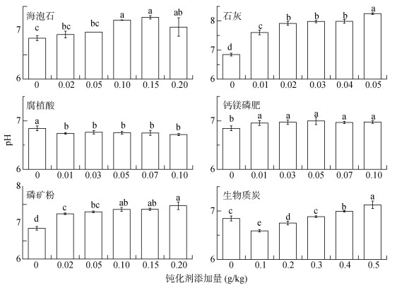 2 结果与分析 2.1 土培试验各处理土壤pH变化添加钝化试剂后,各处理土壤pH均有不同程度的变化(图 1)。与对照相比,腐植酸处理降低土壤pH,钙镁磷肥处理提高土壤pH,但两种钝化剂的不同添加量间土壤pH均无显著差异;海泡石、石灰以及磷矿粉处理均显著提高土壤pH,随添加量增加而升高,但低施用量下土壤pH增率大于高施用量;生物质炭在低添加量下(0.10 g/kg和0.20 g/kg)土壤pH显著低于对照,在0.4 g/kg和0.5 g/kg时高于对照。