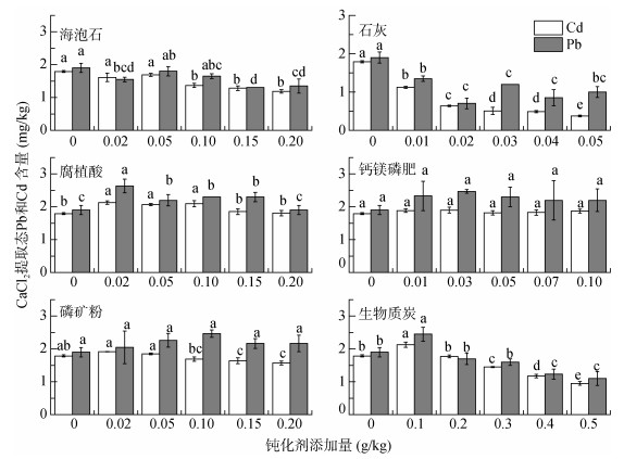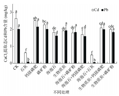 图 2 不同处理下土壤0.01 mol/L CaCl2提取态Cd、Pb含量变化 Fig. 2 Soil Cd and Pb concentrations extracted by 0.01 mol/L CaCl2 under different treatments |