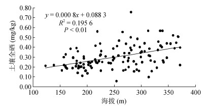 对挂甲峪地区土壤全硒含量与海拔做相关性分析(图 2),结果表明,土壤全硒含量与海拔高度呈显著正相关关系(P<0.01),即土壤全硒含量随着海拔增高有增加趋势。
