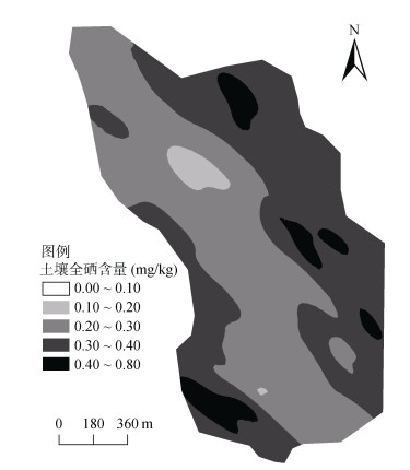 采用ArcGis10.2.2软件克里金插值方法绘制土壤全硒含量分布图(图 3)。由图 3可知,挂甲峪地区土壤硒含量分布不均匀,整体上呈北西向带状分布。高硒土壤主要分布在区域西南角(林全亭的西北方向)、北侧山坡上和东侧山坡上,空间分布比较集中。