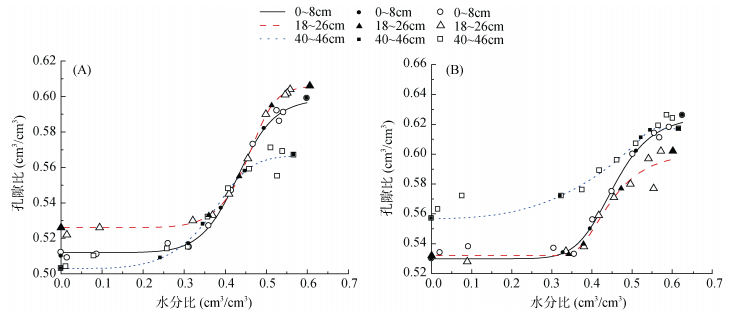 图 1是耕作与免耕条件下原状甘蔗地土壤在室内自然风干条件下的收缩曲线图,其中实心点为拟合曲线的5个拐点,空心点为实测值。由图 1可知:随着甘蔗地土壤水分比逐渐降低,耕作与免耕条件下的土壤收缩曲线大致呈现“S”型。在耕作条件下,18 ~ 26 cm土层对应的收缩曲线位于最上方,40 ~ 46 cm土层对应的收缩曲线位于最下方。在免耕条件下,40 ~ 46 cm土层土壤收缩曲线位于收缩曲线的最上方,0 ~ 8 cm和18 ~ 26 cm土层在水分比小于0.40时表现一致,当水分比大于0.40时,0 ~ 8 cm土层收缩曲线位于18 ~ 26 cm土层之上,且两者之差逐渐拉大。当水分比小于0.2时,耕作条件下的甘蔗地土壤孔隙比保持不变;当水分比小于0.3时,免耕条件下的土壤孔隙比保持不变,该水分下的土壤孔隙比为最小孔隙比。由图 1可知,免耕条件下的最小孔隙比大于耕作条件下。耕作和免耕条件下的土壤最小孔隙比各不相同,说明耕作在一定程度上能够改变土壤的最小土壤孔隙比以及最小孔隙比对应的水分比。