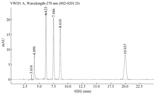 1.6.2 高效液相色谱测定条件色谱柱:Shim- packVp-ODS(250 mm × 4.6 mm, 5 μm);紫外检测器,波长270 nm;流动相:乙腈:0.1%甲酸(80:20);流量1.0 ml/min;进样量20 μl;柱温25 ℃。
