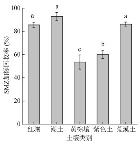 潮土与荒漠土中SMZ回收率最高,这与土壤pH较高有关,王娜[8]发现,pH > 6.5使得SMZ阴离子比例大大增加,吸附性减弱,提高回收率。而这两种土壤pH均大于6.5,因此SMZ回收率较高。而紫色土的pH同样大于6.5,但其回收率却依然较低,这可能与土壤其他性质有关,如颗粒组成等[33-34]。