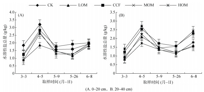 2 结果与分析 2.1 有机肥替代部分化肥对盐碱地土壤盐分的影响 2.1.1 有机肥替代部分化肥对盐碱地土壤水溶性盐总量的影响如图 1所示,4月5日前后,由于气候条件,水分蒸发量大,土壤水溶性盐总量上升,其他时期相对稳定。0~20 cm和20~40 cm土层盐分含量变化规律基本相同,且0~20 cm土层盐分含量普遍高于20~40 cm。在0~20 cm土层,4月5日前土壤水溶性盐总量呈现为CK>CCF>各有机肥替代处理,4月5日后土壤水溶性盐总量呈现为CCF>CK>各有机肥替代处理,特别在5月26日小麦灌浆期,与CK相比,CCF处理的土壤水溶性盐总量上升了20.4%,而LOM、MOM、HOM处理分别下降了28.3%、21.2%、22.0%。在20~40 cm土层,土壤水溶性盐总量基本呈现CK>CCF>LOM>HOM>MOM的趋势; 且与CK相比,CCF与之差距较小,而LOM、MOM、HOM 3个处理土层水溶性盐分含量普遍低于CK,特别是在5月9日小麦返青期和6月8日小麦成熟期处理间差异显著; 小麦成熟期LOM、MOM、HOM处理与CK相比土层水溶性盐总量分别下降了34.3%、36.7%、26.6%。0~20 cm和20~40 cm土层水溶性盐分含量变化均说明有机肥替代部分化肥能够降低盐碱地耕层土壤盐分含量,进而改善盐碱地土壤环境。