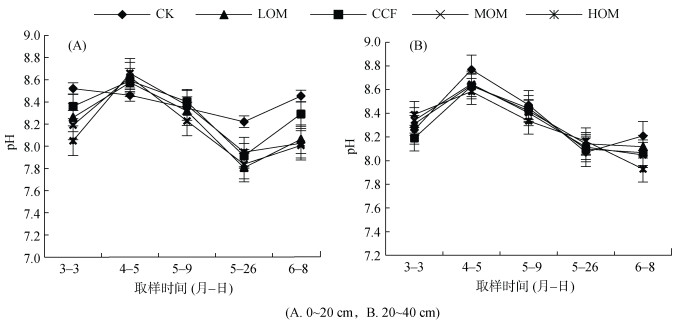 如图 2所示,不同时期各个土层土壤pH差异明显,4月5日前后,土壤pH达到峰值,后期呈明显下降趋势。0~20 cm土层pH在峰值时各处理均高于CK,但在其他时期各处理的土壤pH均明显低于CK,特别是在3月3日、5月26日及6月8日前后各处理间差异显著,基本表现为CK>CCF>LOM>MOM>HOM; 在6月8日小麦成熟期时,有机肥替代处理LOM、HOM、MOM的pH较CCF处理分别下降了27.7%、33.8%、31.4%。20~40 cm土层各处理间pH差异不明显。说明有机肥替代化肥处理对盐碱地0~20 cm土层pH影响明显,且随着有机肥替代量的增加土壤pH呈逐渐下降趋势。