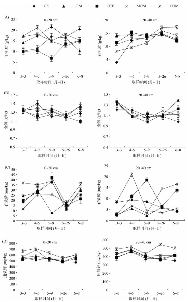 如图 3A所示,由于秸秆还田等诸多因素的影响,各处理间土壤有机质含量存在差异,但变化无明显规律,可以看出各土层有机肥替代处理的有机质含量高于CK、CCF,说明有机肥替代化肥,可增加土壤中有机质的含量。如图 3B、3C所示,全氮和有效磷含量在施肥处理间存在一定差异但变化无明显规律,0~20 cm土层全氮和有效磷含量普遍高于20~40 cm。0~20 cm土层,4月5日左右CK处理的全氮含量明显高于其他处理,但在6月8日小麦收获期时,LOM、MOM、HOM处理的全氮含量已经超过CK处理,较CK处理分别提高14.2%、2.4%、15.7%。6月8日小麦收获期,0~20 cm土层,CCF处理有效磷含量最低,LOM、MOM、HOM处理较CCF分别高39.0%、67.0%、46.8%;20~40 cm土层,CK处理有效磷含量最低,CCF、LOM、MOM、HOM处理较CK分别高241.8%、14.7%、309.5%、36.4%。如图 3D所示,0~20 cm土层速效钾含量高于20~40 cm土层,0~20 cm和20~40 cm土层速效钾含量变化规律基本一致。在各个时期HOM处理土壤速效钾含量均为最大值,且明显高于其他处理; 其次为MOM处理,其他处理间差异较小。到6月8日小麦收获期时,与CK处理相比,0~20 cm土层CCF、LOM、HOM、MOM速效钾含量分别高13.2%、21.2%、27.2%、27.1%;20~40 cm土层CCF、LOM、HOM、MOM速效钾含量分别高17.7%、17.6%、17.9%、42.3%。