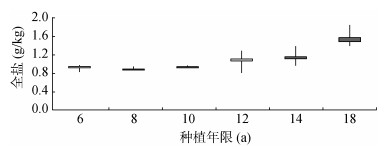 2 结果与分析 2.1 土壤全盐量由图 1可见,土壤全盐量随种植年限的延长而增加; 前期全盐量增加较慢,第6、8、10年平均全盐量分别为0.907、0.887和0.934 g/kg。随着时间的延长,全盐增加幅度变大,第12、14、18年的平均全盐量分别为1.061、1.148和1.564 g/kg。且随种植年限的延长,同年限的不同温室间全盐量差异较大,如第10年时,全盐量最高为0.960 g/kg,最低为0.910 g/kg; 而第18年时最高为1.833 g/kg,最低为1.382 g/kg,同年限温室间差异可达0.451 g/kg,且土壤全盐量超过1.0 g/kg,已发生次生盐渍化,对植物生长有一定的危害。
