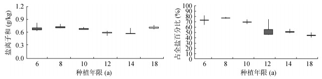 2.2.3 水溶性盐基之和及占全盐的百分比由图 2可见,温室土壤盐离子之和随种植年限的增加而稍有降低,整体差异不大,各种植年限的平均值分别为0.702、0.729、0.690、0.589、0.574和0.697 g/kg。说明土壤溶液中,这些盐分的绝对含量相对稳定。但从盐离子之和占全盐的百分比来看,其随着种植年限的延长而逐渐下降,各年限的平均值分别为77.58%、82.20%、73.95%、58.20%、54.13%和46.47%,自第12年开始急剧降低。说明随着种植年限延长,土壤盐离子组成已发生较大改变,由于施肥量的增加,土壤中增加了许多其他盐离子。