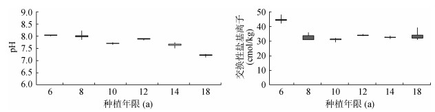 4) 土壤pH随种植年限的增加而降低,H+被土壤胶体吸收后,土壤表面氢饱和度逐渐提高,盐基饱和度逐渐下降,交换能力下降,土壤肥力下降。