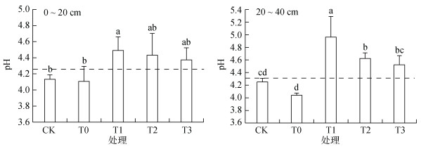 2 结果与分析 2.1 不同调理剂对茶园土壤pH的影响施用不同调理剂处理1 a后,茶园土壤pH的变化如图 1所示,其中虚线表示施用前土壤初始pH。结果表明,在0 ~ 20 cm和20 ~ 40 cm土层中,3种土壤调理剂均能不同程度提高土壤pH。其中,在0 ~ 20 cm土层,“亚科丰”、“田师傅”和生物质炭分别提高土壤pH 0.23、0.17和0.11个单位,但三者之间差异不显著(P > 0.05);在20 ~ 40 cm土层,“亚科丰”、“田师傅”和生物质炭分别提高土壤pH 0.65、0.31和0.21个单位,“亚科丰”与其他两种改良剂呈显著性差异(P < 0.05)。对照处理和配方肥处理的土壤pH较初始pH有所下降,两者之间差异不显著。