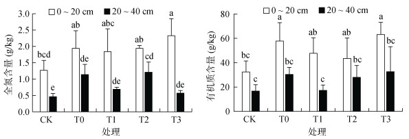 图 2 不同施肥处理对茶园土壤全氮和有机质含量的影响 Fig. 2 Soil total nitrogen and organic matter contents under different fertilization treatments |