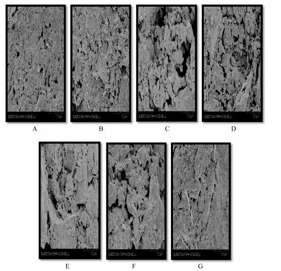 (A、B、C、D、E、F、G分别表示CK、LN、MN、HN、LA、MA、HA处理) 图 1 土壤扫描电镜图像(1 000倍) |