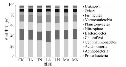 2.2.2 土壤细菌群落组成如图 2所示,选定相对丰度高于0.1%的细菌类群制作多样品物种分布图,从图中可以看出,不同处理样品中在门水平上主要包括酸杆菌门(Acidobacteria)、放线菌门(Actinobacteria)、拟杆菌门(Bacteroidetes)、绿弯菌门(Chloroflexi)、芽单胞菌门(Gemmatimonadetes)、硝化螺旋菌门(Nitrospirae)、浮霉菌门(Planctomycetes)、变形菌门(Proteobacteria)、疣微菌门(Verrucomicrobia)、厚壁菌门和其他一些未能分类鉴定的微生物类群。不同试验组中优势类群主要为变形菌门、酸杆菌门、芽单胞菌门和放线菌门。由表 5中可看出放线菌门在CK中比其他处理都高,最高可高出3%,说明盐碱处理下不利于放线菌门的生长繁殖,但是对于变形菌门和芽单胞菌门其所占比例普遍高于CK,MN和MA处理下变形菌门相对于CK处理所增幅度可达3%和2%,其中在氯化钠处理下放线菌、芽单胞菌、变形菌所占比例高于碳酸钠处理下,酸杆菌则相反。