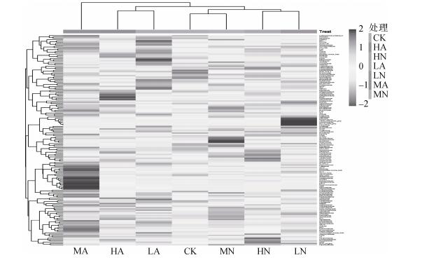 如图 3所示,基于OTU结果用不同颜色变化来表示不同样品在科水平上的群落组成相似性,图中所表示的是不同处理下科水平热图聚类情况。从图中可以看出,HA处理和LA处理的相似性较近,聚为一类,CK、MN、HN及LN可聚为一类。MA处理位于较远的聚类分支上,且MA处理与其他组在颜色分布上相差较大,从而可以看出盐处理下和碱处理下的微生物聚集情况不相似。