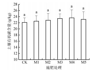 2 结果与分析 2.1 不同施肥处理对土壤有机碳含量的影响不同施肥处理对土壤有机碳含量的影响如图 1所示,CK处理土壤有机碳含量为22.1 g/kg,M1处理为22.5 g/kg,有机无机肥配施增加土壤有机碳的含量,但未达到显著水平。其中M2处理为22.8 g/kg;M3处理为23.4 g/kg;M4处理有机碳含量最高,为23.6 g/kg,与对照相比增加了6.79%。