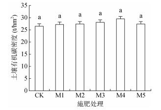 不同施肥处理对土壤有机碳密度的影响如图 2所示。由图 2可知,对照处理的有机碳密度为26.5 t/hm2;仅施化肥时有机碳密度为27.2 t/hm2。相对于CK和M1,有机无机肥配施可增加有机碳密度,M2、M3、M4、M5处理有机碳密度分别为27.4、28.1、29.5、27.4 t/hm2,相互间差异均未达到显著水平。
