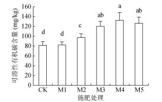 不同施肥处理对土壤可溶性有机碳含量的影响如图 3所示。CK处理可溶性有机碳含量为81.5 mg/kg,仅施化肥(M1)处理为82.2 mg/kg,对可溶性有机碳的含量无显著影响,而随着有机肥的逐渐施入(M2 ~ M4处理),可溶性有机碳含量逐渐升高,达到极显著水平。但M5处理的可溶性有机碳含量为126.2 mg/kg,相对于M4处理时的132.5 mg/kg又略有下降,说明有机物料施入量达到一定时,继续施用对可溶性有机碳含量变化并无显著影响。相对于M1处理,M4处理使可溶性有机碳含量提高了61.2%。结果说明,无机化肥的施用对土壤中可溶性有机碳含量无太大提升效果,而有机无机肥配施,可显著提升其含量。