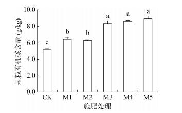不同施肥处理对土壤颗粒有机碳含量的影响如图 6所示,相对于CK处理时土壤颗粒有机碳的含量5.2 g/kg,M3处理时含量达到8.3 g/kg,增加了60.29%;M4处理时达到8.6 g/kg,增加了65.74%;M5处理时颗粒有机碳含量达到8.9 g/kg,增加了71.30%。由此可知,增施有机肥可显著增加土壤颗粒有机碳含量。