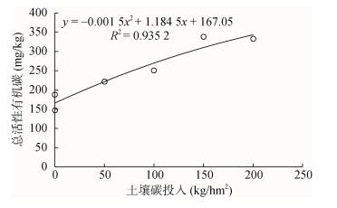 如图 7所示,土壤碳投入和总活性有机碳呈极显著的相关关系,随着土壤碳投入量的增加,土壤总活性有机碳显著升高,两者之间的数学关系式为:y = -0.001 5x2+1.184 5x+167.05,经过土壤碳投入x对总活性有机碳y的一阶导数,求得最大碳投入量为5 922 kg/hm2,这个量超过了本试验的范围。但从图上可以看出,M4与M5处理的总活性炭最高,且增幅放缓。