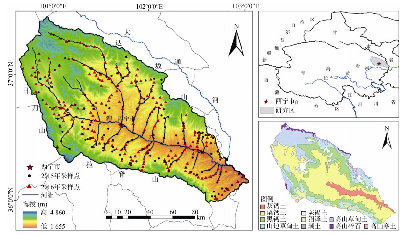 1 材料与方法 1.1 研究区概况湟水是黄河上游最大的一级支流,发源于青海省海晏县境内,青海境内全长336 km。湟水流域位于青海东部地区,地处36°02′ ~ 37°28′N,100°42′ ~ 103°04′E(图 1),是黄土高原向青藏高原的过渡地带。流域内地形比较复杂,内有河谷盆地、丘陵和中高山地,海拔1 655 ~ 4 860 m,流域西宽东窄,西高东低,为高原干旱、半干旱气候,气温由西向东逐渐升高[15]。流域内主要土壤类型为灰钙土、栗钙土、黑钙土、灰褐土、高山草甸土、山地草甸土等,主要农作物有油菜、马铃薯、春小麦、玉米、青稞、燕麦等,是青海省主要的农业区。